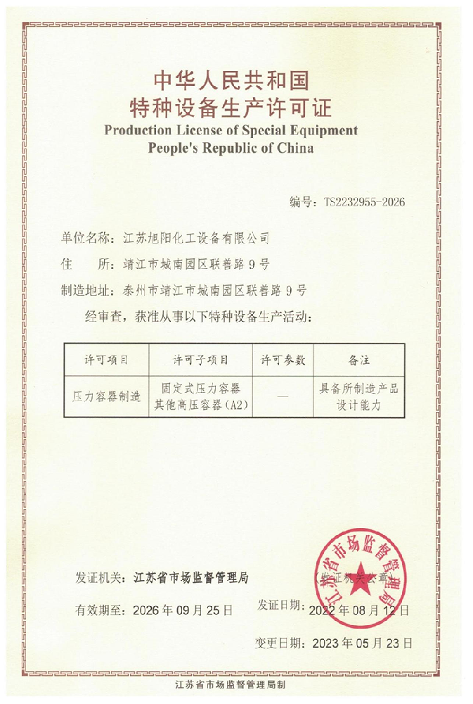 江蘇旭陽化工設(shè)備有限公司專業(yè)從事各類化工、環(huán)保、制藥、發(fā)酵、食品、新材料、鋰業(yè)等項(xiàng)目設(shè)計(jì)、制造及壓力容器的生產(chǎn)制造,是一家集研發(fā)、生產(chǎn)和進(jìn)出口貿(mào)易于一體的高科技企業(yè)。